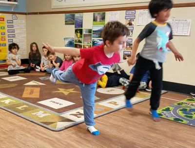 The reason that children are excited by Kinderdance® programs year after year is because the programs evolve with your child’s developmental age group. Our curriculum builds on itself over time from Kindertots® class (for two year-olds) to Kinderdance® or Kindergym® (Levels 1 and 2 for 3-5 years) to Kinderdance®(Level 3) or Kindermotion® (for 5-8 years). Our curriculum’s evolution allows children to feel good about what they have already learned while feeling challenged and stimulated by new material and skills. Every month brings a new theme, songs and dances. Our monthly themes often reflect the children’s school curriculum, which excites them, and may focus on a holiday that month or how nature is changing within that month. There is always a “color” and a “number of the month” and fun imagination songs and games associated with that month.